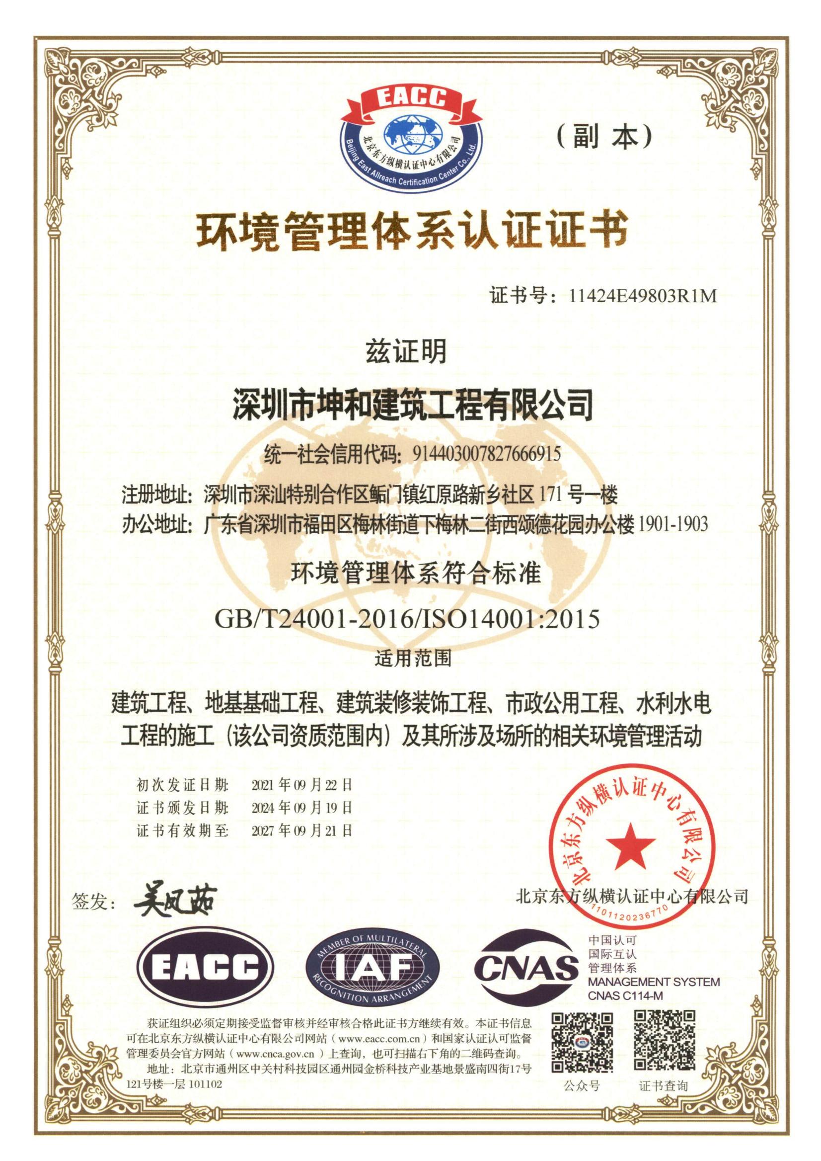 深圳市坤和建筑工程有限公司于二00五年十一月廿八日成立,經過全體員工的共同努力,公司發展迅速,目前公司注冊資金為12010萬元,是一支具有房屋建筑工程施工總承包一級;市政公用工程施工總承包一級;水利水電工程施工總承包二級;地基基礎工程專業承包二級;建筑裝修裝飾工程專業承包二級;建筑機電安裝工程專業承包三級;鋼結構工程專業承包三級資質的專業施工隊伍,并于二00六年通過了ISO9001:2008標準﹑ISO14001:2004標準﹑GT/B2800-2001標準三項管理體系認證。 公司目前擁有各類專業技術人員351人。建筑工程、市政公用工程、水利水電工程、機電工程等各專業注冊建造師99人,注冊造價師5人,高級技術職稱20人,中、初級工程技術職稱和經濟、財會系列的專業人員331人。同時公司設備精良,擁有各類大型工程機械設備391臺,總功率達9600kw以上,這些設備為承接各類工程,確保高效、優質、安全施工奠定了堅實的基礎,是一家擁有全方位施工能力的建筑施工企業。公司多次獲得上級部門的表揚和嘉獎。 公司內部實行計算機智能化管理,建立了一套完善的質量、安全管理體系和制度。嚴格遵守國家規定的各類法律和各項規章制度,積極貫徹以“安全生產、文明施工”為主的生產作業指導方針;始終遵循“質